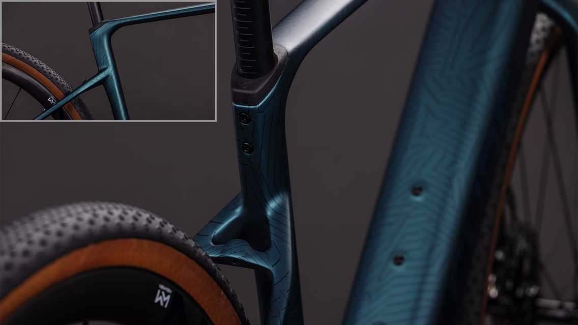 La forme se met au service de la fonction avec l’élégant cadre carbone du Cube Nuroad Hybrid C:62. Bien sûr, il est très attrayant, avec son profil élégant et ses courbes organiques, mais, les ingénieurs de la marque n'ont pas oublié la commodité, avec son dégagement pour des pneus pouvant aller jusqu’à 50 mm, même en présence de garde-boues. Ou encore ses points de fixation pour porte-bagages à l’arrière et sur sa fourche en carbone, pour un maximum de polyvalence. L'unité de commande de son système d’entraînement Bosch est incorporée dans le tube supérieur, avec un léger déport de son cintre, et son cadre est compatible avec le système PowerMore (vendu séparément) pour booster la capacité de la batterie de 250 Wh. Le collier de selle est caché, il dispose d’un guide-chaîne Direct Mount très léger, d'une fixation Flatmount pour béquille, d’un axe arrière Boost et d’une patte de dérailleur UDH.